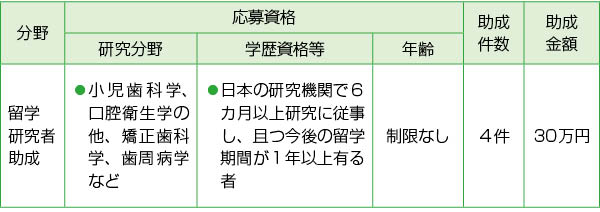 海外からの留学研究者は4月1日現在、日本の研究機関で6ヵ月以上研究に従事し、また今後の留学期間が1年以上であり、口腔衛生学、小児歯科学の他、矯正歯科学、歯周病学などの分野の研究に従事する者を対象とする。